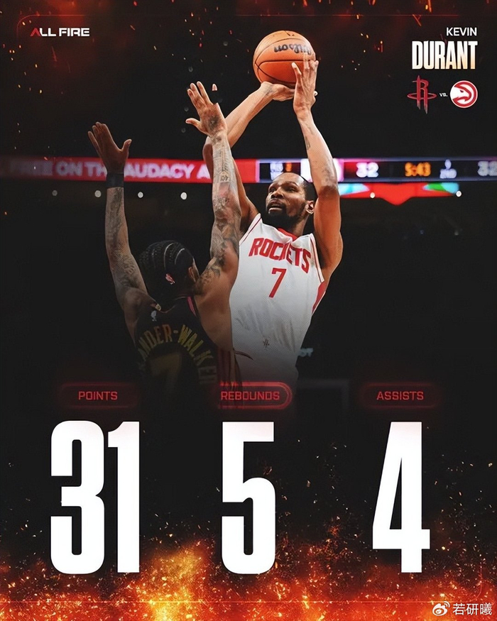 火箭以104-86轻松击败了残阵老鹰。尽管老鹰因伤病缺席了多名主力球员,如老大约翰逊和内线中锋奥孔古等人,但火箭的处境其实更为艰难。球队两大核心后卫范乔丹和内线支柱亚当斯均已赛季报销,这对原本在休赛期雄心勃勃的阵容造成了沉重打击。去年火箭在季后赛中被勇士黑七淘汰,主要原因就是缺少一锤定音的终结者。为此,休赛期球队果断出手,用杰伦格林和狄龙等资产从太阳换来了·杜兰特。这笔交易极大提升火箭的上限,杜兰特攻防两端的统治力毋庸置疑,他的得分爆发力和关键球能力让球队在进攻端多了一把锋利的杀器。